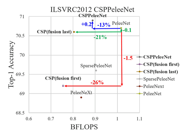 - PeleeNet에서 feature pyramids를 생성할 때 memory 사용량을 75% 감소할 수 있었다 - CSPNet은 CNN에서 학습 용량을 증가시킬 수 있고 작은 모델에서 더 좋은 정확도를 얻을 수 있다.